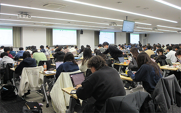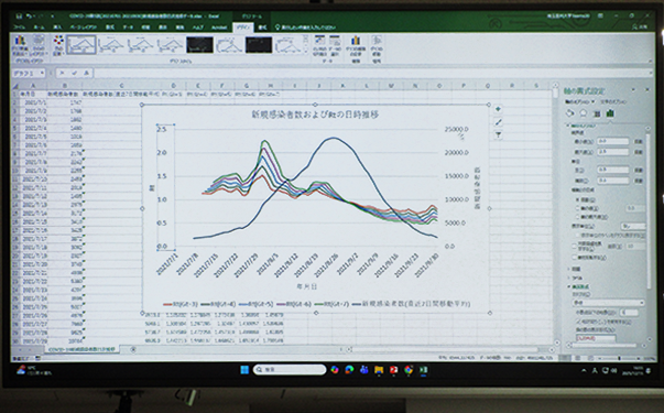 演習の終盤では、流行曲線を描く個人ワークとして、Excelを用いたグラフ作成に挑戦しました。多くの学生が積極的に教員へ質問する姿が見られ、 1年生で学習したデータサイエンスの知識を駆使して感染症の流行を「数字」から理解しようとする真剣な様子が印象的でした。