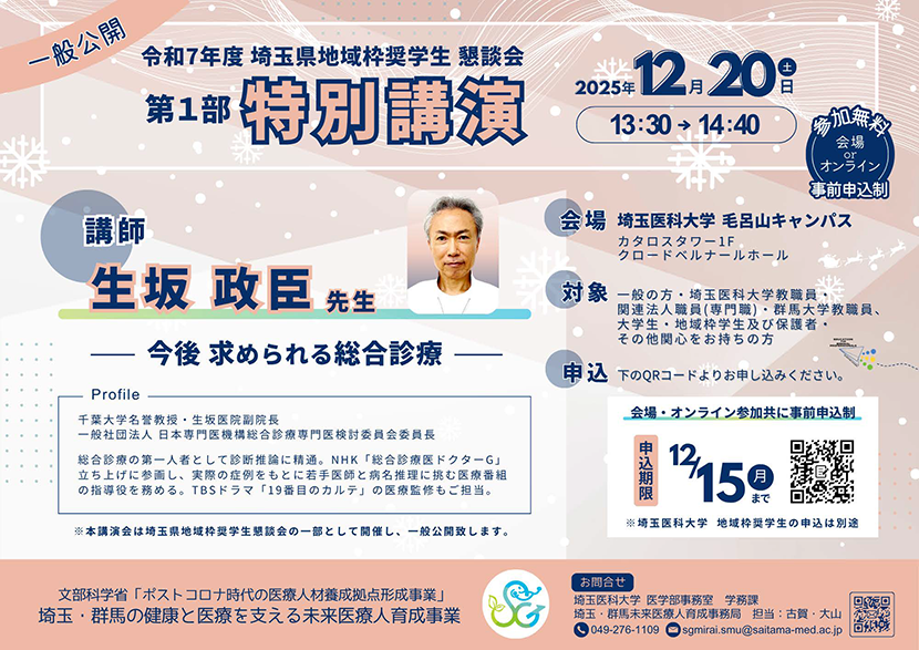 埼玉県地域枠奨学生懇談会の第1部として、千葉大学名誉教授・生坂政臣先生を講師にお迎えし、特別講演「今後 求められる総合診療」をオンライン併用で開催します。